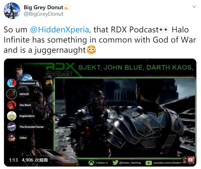 据推特用户@BigGreyDonut发布的消息称,Real Deal Xbox播客表示,《光环:无限》和《战神4》有一些类似的东西,是一部巨作。