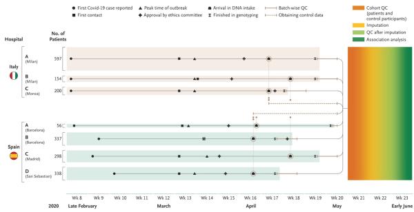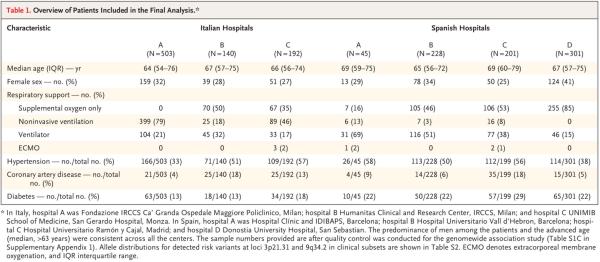 该研究对1980名出现呼吸衰竭的新冠重症患者患者进行全基因组关联研究,这些患者来自欧洲疫情重灾区的意大利、西班牙的7家医院。经过质量控制和排除异常值后,研究者最终的分析了包括来自意大利的835名患者和1255名对照组参与者,以及来自西班牙的775名患者和950名对照组参与者。研究总共分析了8582968个单核苷酸多态性,并对两个对照组进行了荟萃分析。