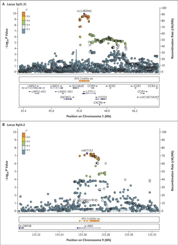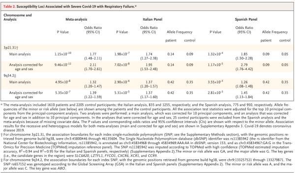 在主荟萃分析中,研究者发现两个与新冠病毒诱导的呼吸衰竭相关的基因座(P<5×10的负8次方):3p21.31基因座的rs11385942位点插入缺失GA或G变异位点 (GA等位基因优势比为1.77;95%置信区间,1.48 -2.11); 9q34.2基因座的rs657152 A或C SNP (A等位基因的优势比为1.32;95% 置信区间, 1.20 - 1.47)。