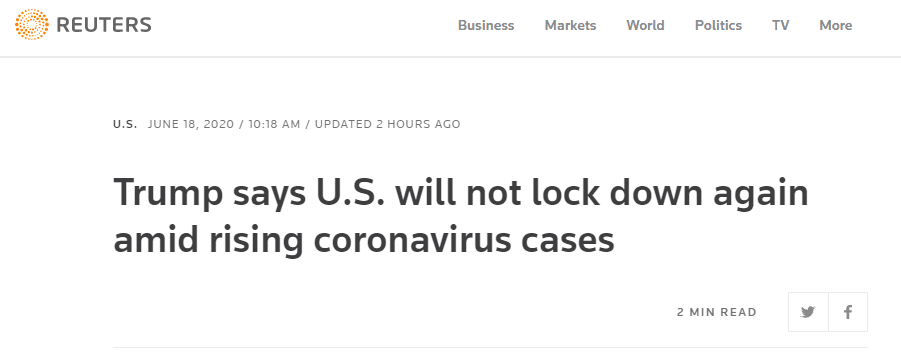 路透社称,在特朗普发表上述言论之前,白宫经济顾问拉里·库德洛和美国财政部长史蒂文·姆努钦均表示,美国不会再次关停经济。报道援引《纽约时报》消息称,副总统彭斯在与州长们的电话会议中也鼓励他们重申政府的说法,即病例增加是扩大病毒检测的结果。