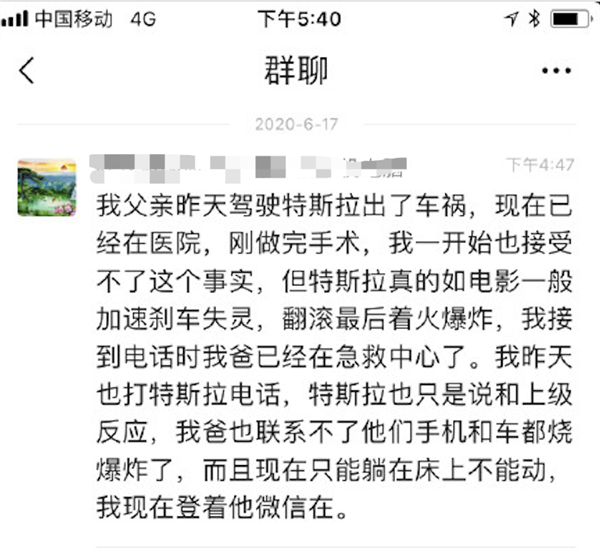 此外,网上流传的一组图片显示,有称是车主家属的表示,车主是自己的父亲,所驾驶的Model 3车辆,遭遇了电影画面一般的自动加速、刹车失灵、最后翻滚后着火爆炸的事故。