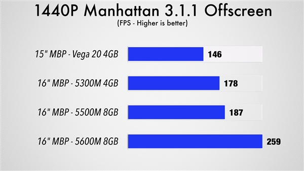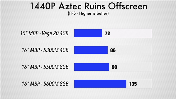 GFXBench曼哈顿3.1.1、阿兹特克废墟2K离屏测试中,5600M相比于5500M也分别快了38.5%、50%。
