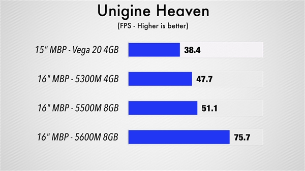 Unigine Heaven更接近游戏性能,5600M表现更加亮眼,不但对比5500M领先了多达48.1%,甚至碾压了Vega 48、Vega 56,分别领先11.3%、5.1%。