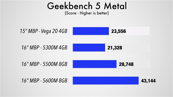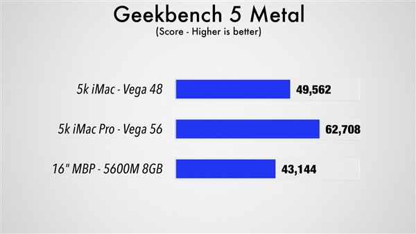 GeekBench 5 Metal测试中,5600M相比于5500M快了足足50.1%,相比于桌面级的Vega 48则只差12.9%。这个项目也是苹果平台专属的,优化到位。