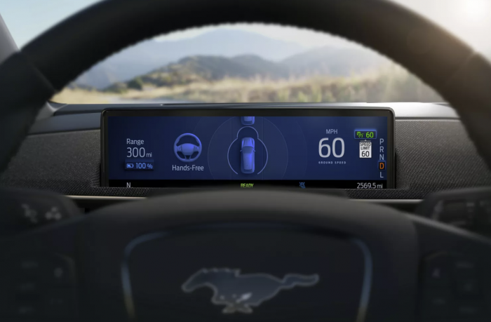 超级巡航系统使用方向盘上的灯光系统来告诉驾驶员何时可以使用该功能,而福特将依靠Mach-E方向盘后面的数字仪表盘来传递这些信息。屏幕上会显示出双手松开或抓住方向盘的动画,让驾驶员知道什么时候可以使用主动驾驶辅助系统,或者什么时候需要重新接管方向盘。