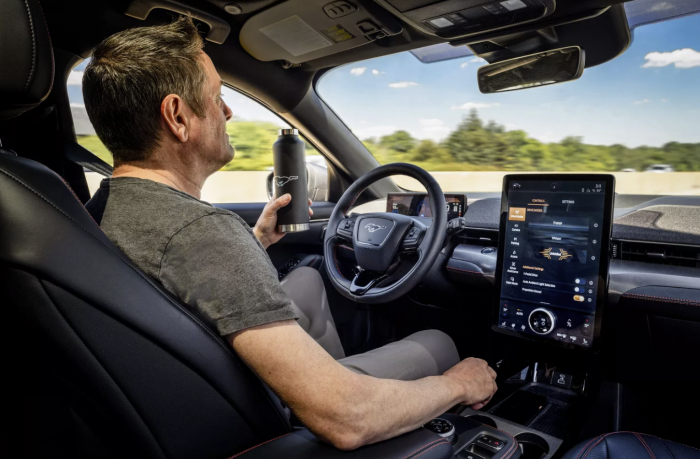 在此之前,车主将可以使用福特第二代高级驾驶辅助系统(ADAS),即CoPilot 360。其中包括车道居中、自适应巡航控制、主动泊车辅助、盲点辅助等功能的改进版本。一旦准备就绪,主动驾驶辅助系统将在福特绘制的高速公路上使用。该公司表示,在推出时,它支持美国所有50个州和加拿大10万英里具有分隔带的公路。野马Mach-E还在方向盘上设置了红外摄像系统,当免提模式启动时,可以确保驾驶员注意路面情况。