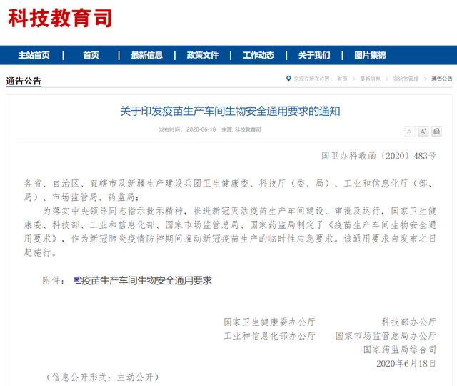 因此为推进新冠疫苗研发生产,按照国务院应对新型冠状病毒感染的肺炎疫情联防联控机制工作部署,国家卫生健康委、科技部、工业和信息化部、国家市场监管总局、国家药监局等五部委联合印发《疫苗生产车间生物安全通用要求》。