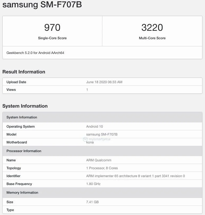 继 2 月份发布的 4G 版 Galaxy Z Flip 折叠屏智能机之后,爆料称三星即将发布换用 5G 基带的 Galaxy Z Flip 折叠屏新机。早些时候,外媒报道称 SM-F707B 已经通过了认证。现在,Geekbench 基准测试数据库又曝光了 5G 版 Galaxy Z Flip 新机的规格,比如高通骁龙 865 SoC 和 8GB RAM 。
