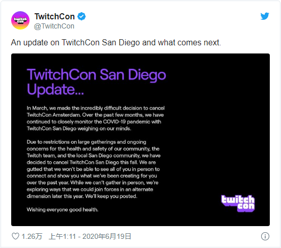 作为亚马逊旗下知名的流媒评平台,Twitch 已于今年三月宣布取消 TwitchCon 阿姆斯特丹站的活动。然而受 COVID-19 疫病持续的影响,该公司又于近日宣布取消 TwitchCon 圣迭戈站的活动。Twitch 团队在一份声明中称:“考虑到社区对于大型聚会的限制,以及人们对于健康和安全的持续关注,我们已决定取消在今年秋季举办的这场活动”。