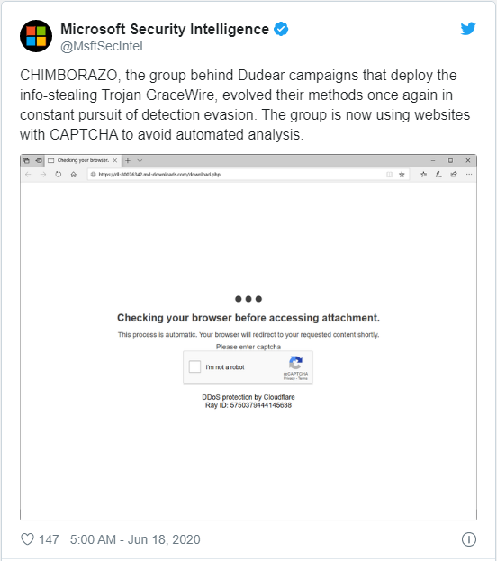 微软安全情报团队于近日曝光了黑客组织 CHIMBORAZO 的新动向,作为 Dudear 和信息窃取木马 GraceWire 的幕后黑手,其再次将目光瞄向了被各大网站用于真人检测的 CAPTCHA 图形验证码。与模糊、扭曲的数字或字母相比,上线十余年的图形验证码能够将许多别有用心者阻挡在外,然而 Chimborazo 却想到了一个更骚的操作。