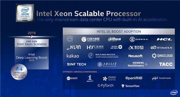 2018年的第二代加入了DLBoost INT8整数格式,44项优化,我们也看到了更多国产机构的名字:科大讯飞、上海交大、京东云、云创大数据、智芯原动、汇医慧影、青云QingCloud、东软等等。