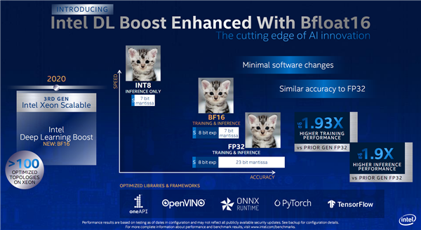 而在最新的第三代上,我们又迎来了新的BFloat16(简称BF16),专为AI运算、深度学习等应用而开发,一方面适当降低了精度(依然很接近FP32),从而提高能效,软件应用也不需要太多调整,另一方面则大幅提升了AI性能,官方宣称相比上代FP32训练性能提升最多1.93倍、推理性能提升最多1.9倍。