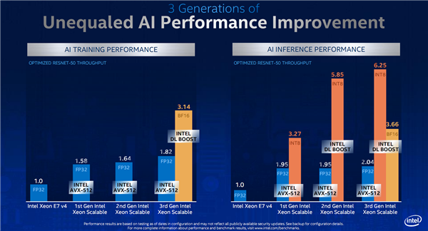 根据Intel官方数据,如果以至强E7 v4系列为基准,AI训练性能方面,三代可扩展至强使用AVX-512的话提升幅度为82%,BF16加持的DLBoost则能带来2.14倍的提升;AI推理性能方面,AVX-512只能获得1.04倍的提升,INT8可达到5.25倍,BF16则是2.66倍。