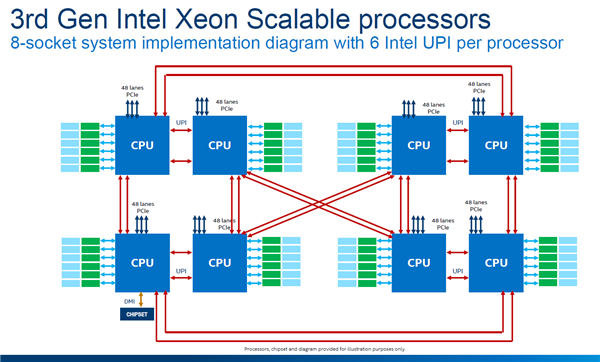 由于面向四路、八路系统,Cooper Lake都内置了六条UPI互连总线,最高传输率达10.4GT/s。