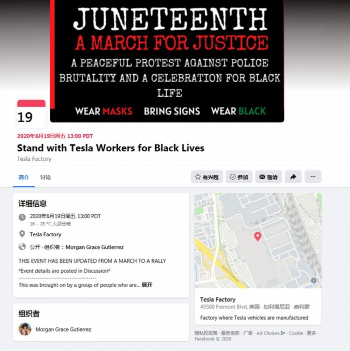 Juneteenth是美国结束奴隶制的一个节日,时间是每年的6月19日。根据 Facebook 的活动宣传页面显示,一些特斯拉员工和社区组织者计划在本周五(19日)在该公司加州弗里蒙特(Fremont)汽车工厂的停车场举行集会。活动主题为“Stand with Tesla Workers for Black Lives”,声援黑人运动。
