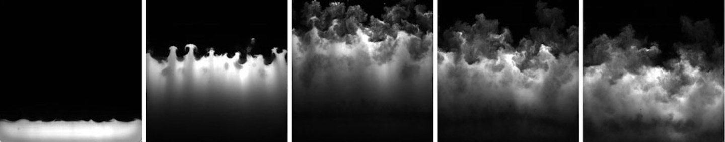 为了触发“超新星”,机器底部有一个小盒子,里面装着被称为研究部爆炸物(RDX)和季戊四醇四硝酸酯(PETN)的东西。这将产生一个微型包含的爆炸,通过披萨片和气体发出冲击波,使它们混合。这些气体被激光照亮,使高速摄像机可以观察到厘米级的情况。而漩涡、扭曲的结果很有超新星的感觉。重质气体的柱子被强行向上穿过轻质层,之后波后的压力下降又将两类气体向下拉伸,混合得更加彻底。