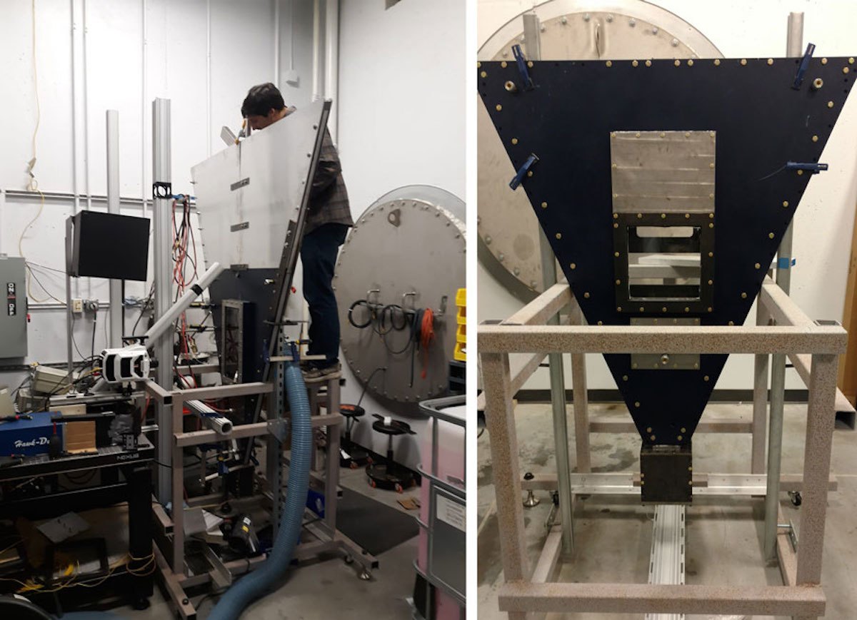 这个装置的形状就像一块披萨,尖尖的一端贴着地面,高6英尺(1.8米),顶部宽约4英尺(1.2米)。中间的窗口显示出一个包含不同密度气体的房间--较重的气体沉在底部,而较轻的气体则漂浮在顶部。这模仿了恒星内部的不同气体层。