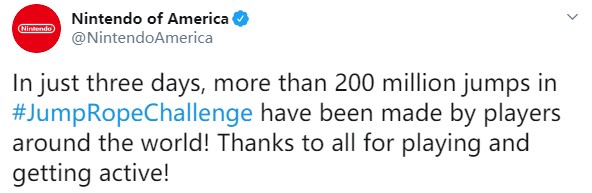 “在仅仅3天时间内,来自全世界的玩家们已经在《Jump Rope Challenge》中跳跃了超过2亿次!感谢大家的积极参与!”