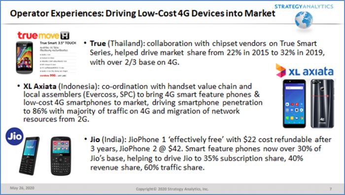 向4G迁移的最终进程取决于对运营商收入贡献最低的那部分用户,这些低ARPU用户甚至对2G和4G手机之间5美元以下的价格差异都很敏感,这一价格差涉及范围太广的话运营商补贴也存在困难。在一次线上圆桌会议上,Kaios VP Joyce Wang分享了低成本4G智能功能机的成功经验,Strategy Analytics认为4G低成本智能功能机是促进发展中地区用户迁移成功的重要因素。印度Reliance Jio推出了基于Kaios操作系统的Jio Phone,成功的将竞争对手的部分2G和3G用户发展成Jio的4G用户,此举也影响了印度市场4G进程,受其影响,Airtel关掉了3G网络,将资源转向4G。