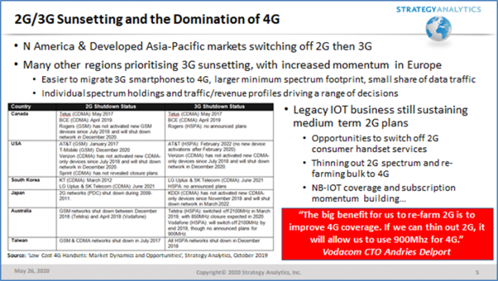 越来越多运营商发布了2G/3G退网计划,北美和亚太一些国家走在了全球2G/3G退网进程的前列,其他区域的2G/3G退网进程也紧锣密鼓,例如,受JIO的颠覆性影响,印度市场加速转向4G,印度Airtel分期关闭了其3G网络;VodafoneZiggo 2月份在荷兰关闭了3G;Telia和Telenor在丹麦的合资公司TT-Netvaerket从2021年4月起将逐步淘汰3G;而Vodafone的CTO在最近的Vodafone商业分析师会议上也谈到要在2022年前在欧洲范围内关闭3G。从3G向4G迁移相对来说容易一些,运营商很容易说服用户从3G智能手机更换成4G智能手机,然而说服拥有2G功能机的人更换成4G智能手机则难得多。