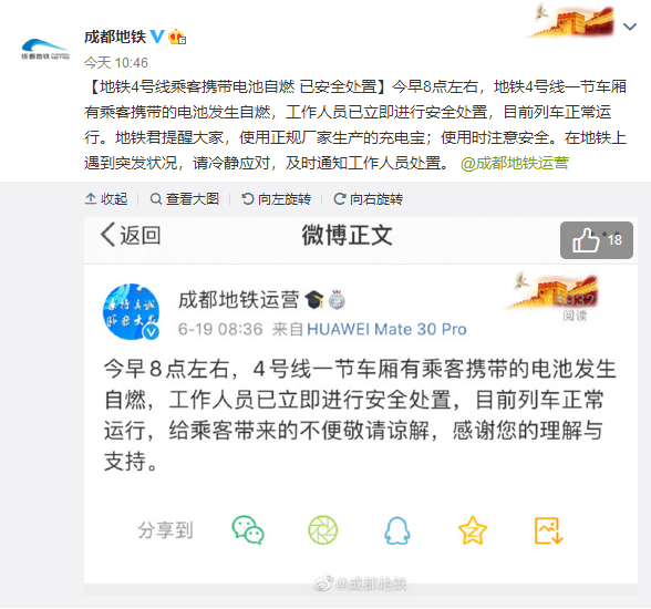 6月19日,据@成都地铁 官方微博消息,当日上午地铁4号线一节车厢有乘客携带的电池发生自燃,目前已正常运行。消息称,今早8点左右,地铁4号线一节车厢有乘客携带的电池发生自燃,工作人员已立即进行安全处置,目前列车正常运行。还提醒乘客要使用正规厂家生产的充电宝并注意安全。