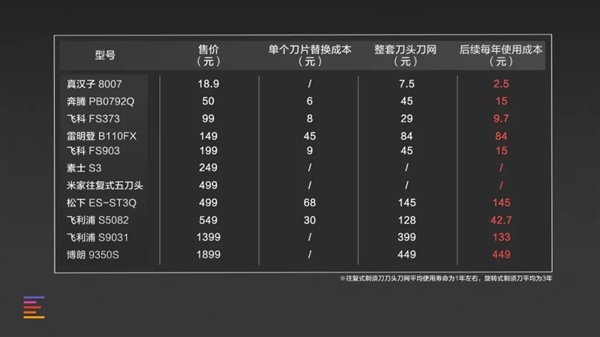 为了方便你们横向对比不同电动剃须刀后续的使用成本,我收集整理了他们的更换价格。