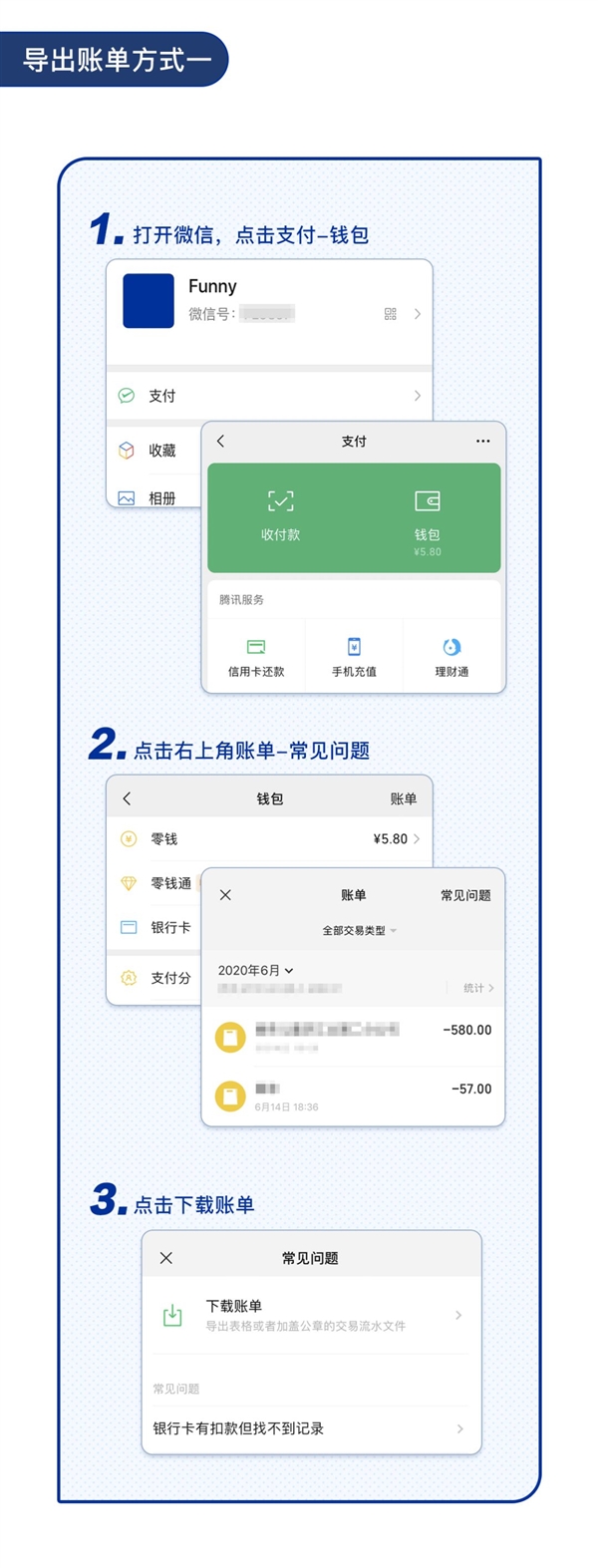 方法一:打开微信,点击支付-钱包,点击右上角账单-常见问题,点击下载账单。