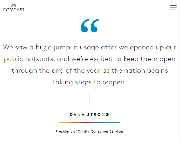 Dana Strong 补充道:自开放公共热点之后,其使用量已经迎来了巨大的增长。随着美国在 COVID-19 危机中逐渐恢复,Comcast 很高兴地宣布这项服务将在年底前继续保持开放。