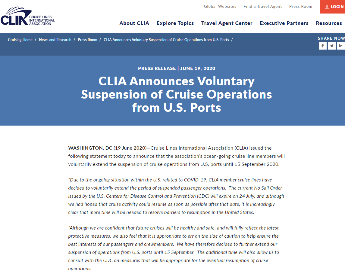 CLIA的声明部分表示,"虽然我们曾希望在该日期后能尽快恢复邮轮活动,但越来越清楚的是,需要更多时间来解决在美国恢复运营的障碍。"