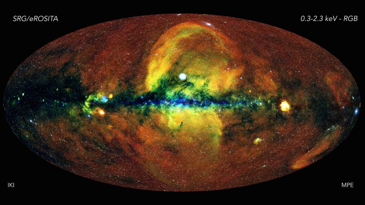 “远离银河系平面的红色漫射光辉是太阳系附近热气体(局部气泡)的发射,”研究人员解释道。“沿着平面本身,尘埃和气体吸收了最低能量的X射线光子,因此只能看到高能量的发射源,它们的颜色在图像中呈现蓝色。”同时,在中心,是用绿色和黄色代表的更热的气体羽流。它们是宇宙中一些最具爆炸性的事件的结果,例如超新星爆炸,甚至可能是被认为是银河系中心的超大质量黑洞的残余物。