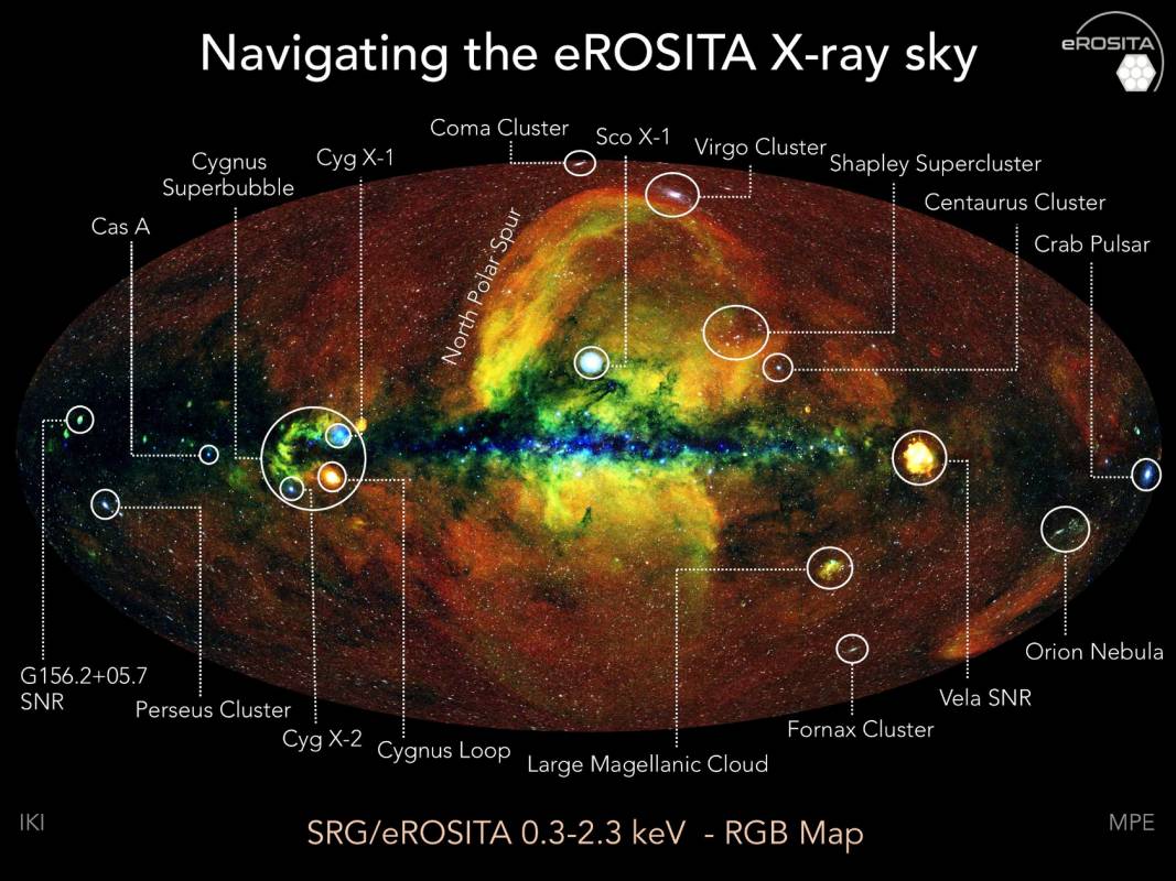 总共有大约100万个X射线源已经在图像中被识别出来。科学家们计划将eROSITA的全天空数据与其他以不同波长收集的仪器的现有数据进行比较。