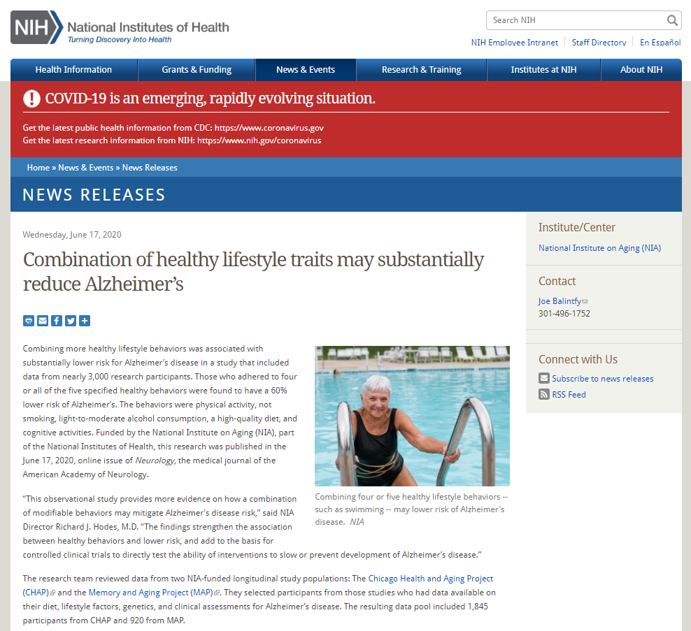 美国国立卫生研究院(NIH)附属国家老龄化研究所(NIA)近日资助了一项研究,将五种生活方式行为与一个人患阿尔茨海默病的风险大幅降低联系起来。这项研究最近发表在《神经病学》杂志上,揭示了坚持至少四种生活方式因素的人患阿尔茨海默病的风险降低了60%。
