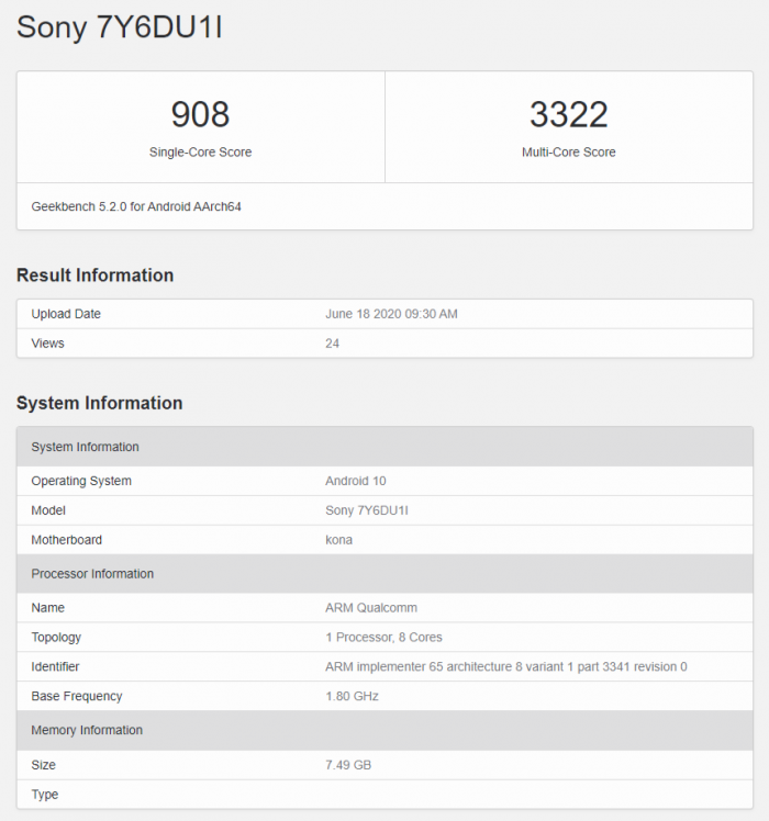 昨天,在 Geekbench 上出现了一款型号为 7Y6DU1I 的神秘索尼手机。清单显示了这款手机将搭载高通骁龙 865 SoC,并搭配 8GB RAM 和 Android 10 操作系统。