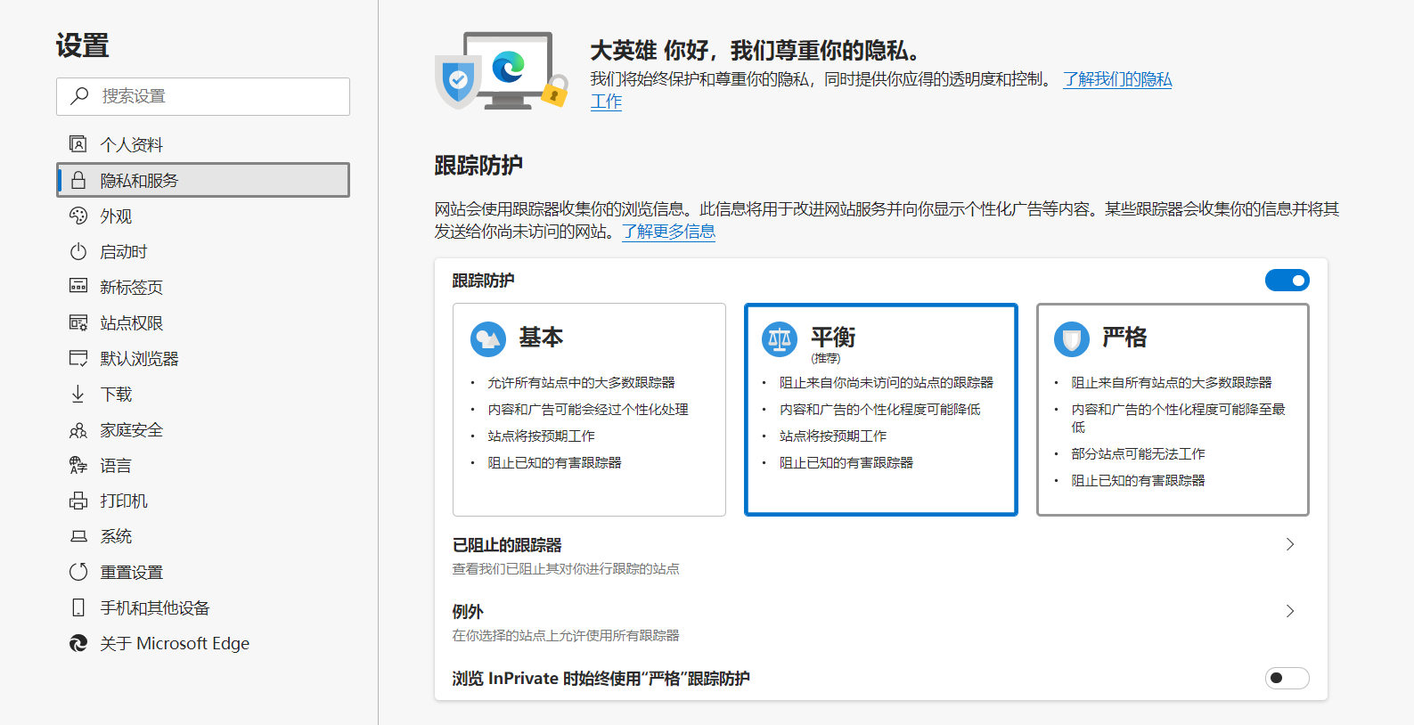 打开 Edge 设置页面,选择隐私和服务,你会看到它包含了三种防护模式,包括基本、平衡、严格三种,这三种能够满足不同用户对于浏览网页时候的需求,个人认为非常方便而且实用,如果你对隐私非常非常在意,可以选择严格防护来保护自己。