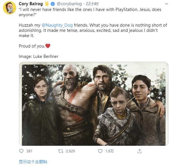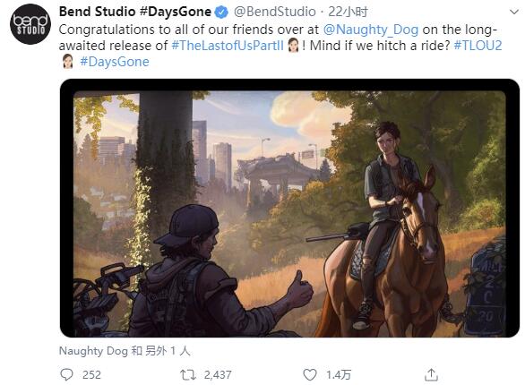 之后是《往日不再》开发商Bend,工作室很善于联想,提供了一张艾莉和《往日不再》主角迪肯·圣约翰走到一起的贺图。