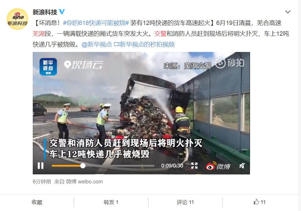 你的618快递可能被烧 装有12吨快递的货车在高速起火