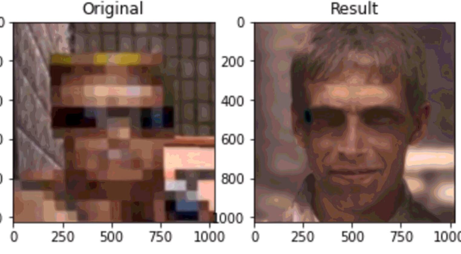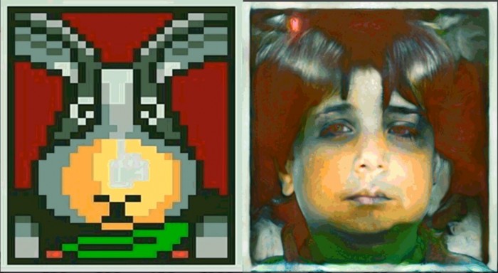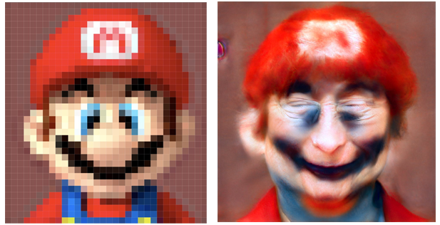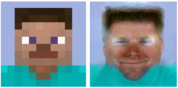 这款“Face Depixelizer(人脸去码器)”由Alex Damian、Sachit Menon和Denis Malimonov共同开发。用户可以上传一张人脸的打码照片,软件会根据算法逆推出无码的人脸。但如果你尝试把像素游戏角色的面部上传过去,就会换来颠覆认知的鬼畜甚至有些恐怖的结果。比如马里奥、史蒂夫的面孔都会让你感到人设崩塌。而这张《猴岛小英雄》主角的五官干脆错位,嘴巴还原到了脖子上。
