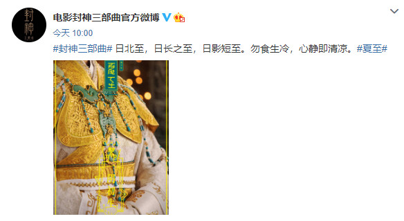6月21日,电影《封神三部曲》发布“夏至节气”海报,庆祝2020年夏至的到来。电影的官方微博还特意提醒大家夏至的特点和应该注意的事项:“日北至,日长之至,日影短至。勿食生冷,心静即清凉。”