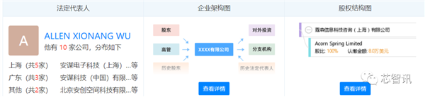 第二:Acorn Spring Limited在国内全资子公司——寇森信息科技咨询(上海)有限公司(以下简称“蔻森信息”)的法人代表正是ARM中国董事长兼CEO吴雄昂(Allen XIONGANG WU)。这似乎也能进一步确认Acorn Spring Limited与ARM公司之间的关系。