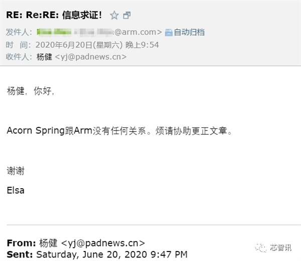 随后,为了进一步确认该消息,笔者也再次向ARM对外的负责人求助,对方回复的邮件再次确认:“Acorn Spring与ARM公司没有任何关系。”