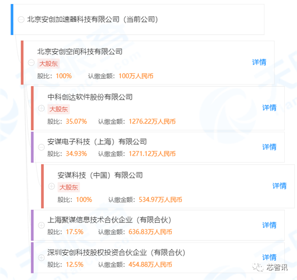 北京安创空间由中科创达控股(持股35.7%),ARM中国通过全资子公司——安谋电子科技(上海)有限公司为北京安创空间第二大股东,间接持股34.83%。