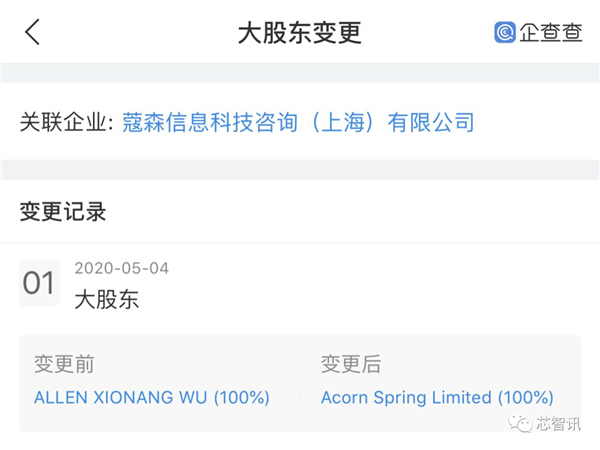 通过企查查可以发现,蔻森信息曾在今年5月4日发生大股东变更,而在变更为Acorn Spring之前,蔻森信息一直是吴雄昂100%持股的。如此看来,Acorn Spring很可能仍是吴雄昂个人控股的。