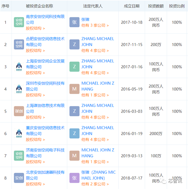 通过天眼查可以看到,吴雄昂控制的蔻森信息旗下拥有一家持股99%的子公司——安创科技,同时,蔻森信息还参股了5家公司。总的这6家公司中的5家的名字中都带有“安创”两个字。