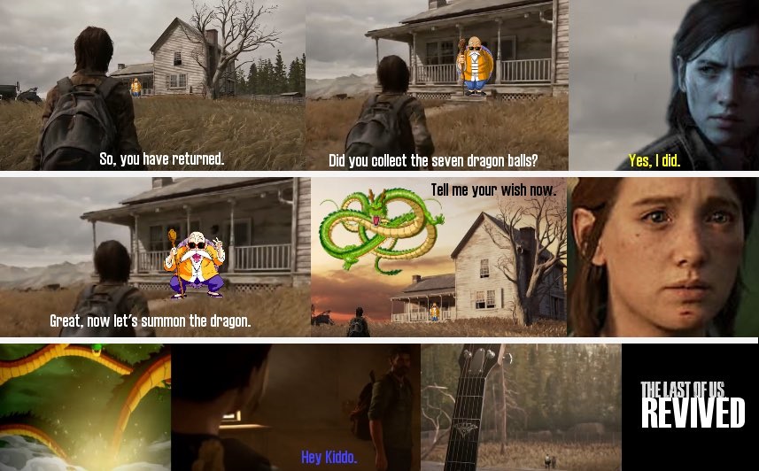更有一厢情愿的玩家制作了《最后的生还者2》DLC的设想图:艾利找到了《龙珠》中的全部七个龙珠,借助神龙的力量复活了乔尔……