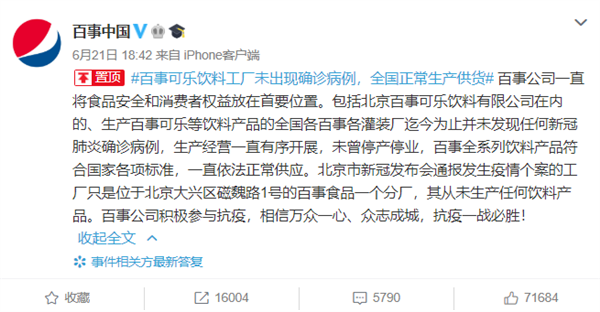 随后,百事中国官微发布声明称,百事公司一直将食品安全和消费者权益放在首要位置。包括北京百事可乐饮料有限公司在内的、生产百事可乐等饮料产品的全国各百事各灌装厂迄今为止并未发现任何新冠肺炎确诊病例,生产经营一直有序开展,未曾停产停业,百事全系列饮料产品符合国家各项标准,一直依法正常供应。北京市新冠发布会通报发生疫情个案的工厂只是位于北京大兴区磁魏路1号的百事食品一个分厂,其从未生产任何饮料产品。