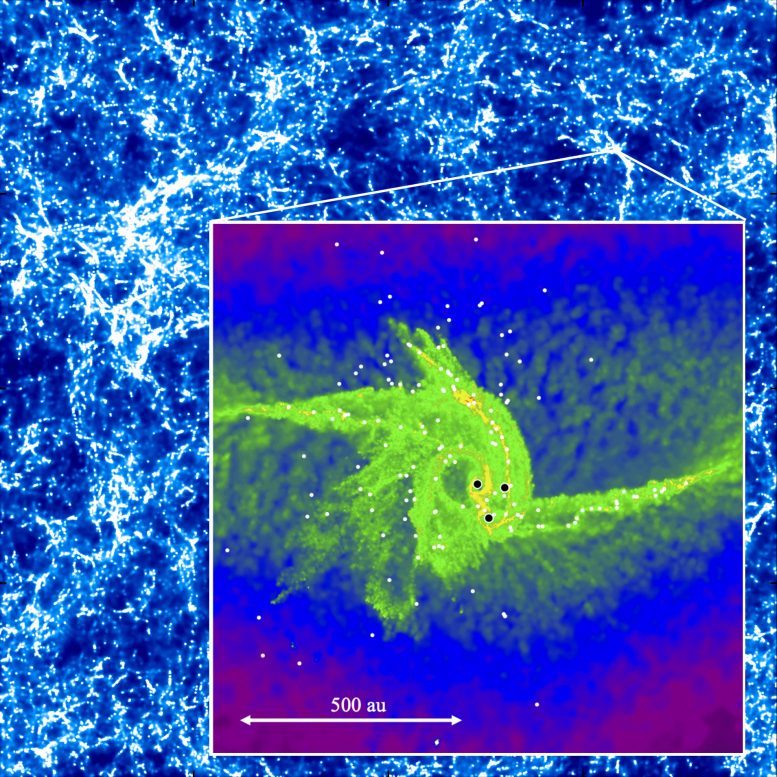 与此前理论预测相同,气体云中心附近形成了大质量恒星,周围的气体快速分裂形成了较小的恒星。随后的模拟中,较小的恒星与气体一同向中心移动,与气体云中心的大质量恒星发生了冲撞与合并——中心附近形成的大质量恒星得以高效成长。这些模拟结果导致了一颗质量比太阳大10000倍的大质量恒星形成,这也是研究人员第一次在富含重元素的云层中,形成了这么大的黑洞“前身”。