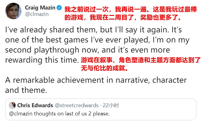 《切尔诺贝利》编剧Craig Mazin在推特中说:“我之前说过一次,我再说一遍。这是我玩过最棒的游戏,我现在二周目了,奖励也更多了。游戏在叙事、角色塑造和主题方面都达到了无与伦比的成就。”
