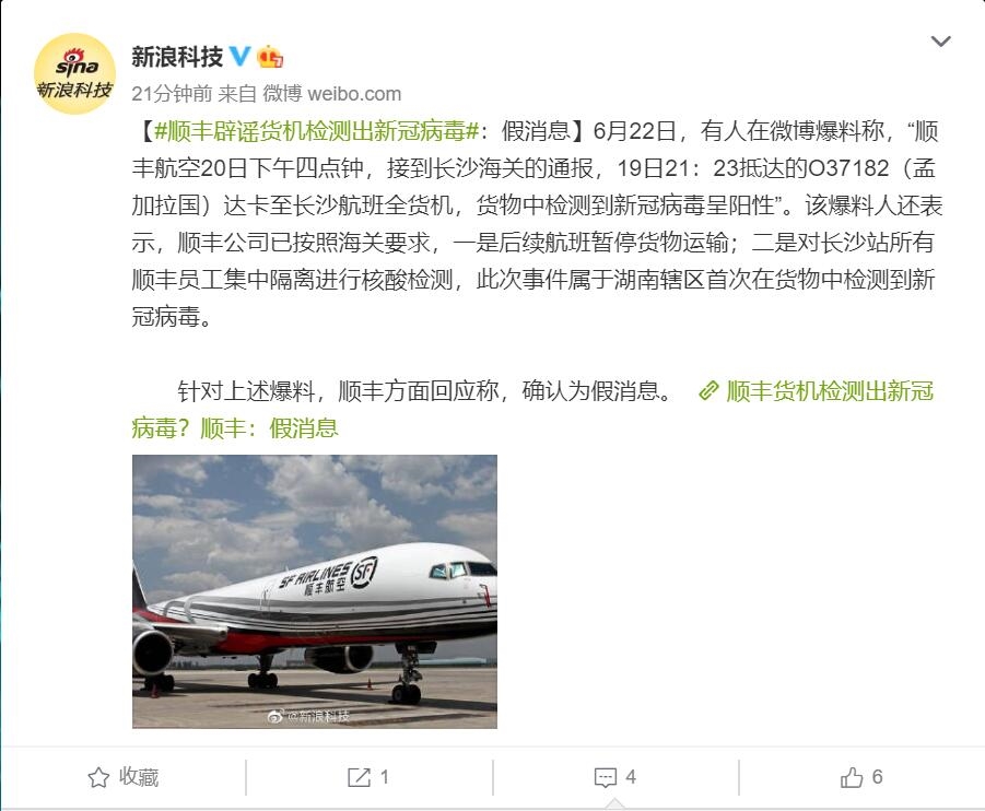 6月22日消息,有爆料称顺丰航空20日下午四点钟接到长沙海关的通报,19日21:23抵达的O37182达卡至长沙航班全货机,货物中检测到新冠病毒呈阳性。该爆料称顺丰公司已按照海关要求,一是后续航班暂停货物运输;二是对长沙站所有顺丰员工集中隔离进行核酸检测。