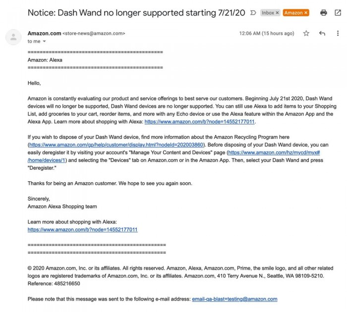 在去年2月停止销售 Dash 按钮、8月关闭功能服务之后,现在亚马逊 Dash 家族的另一款产品-- Dash Wand 也走到了生命的尽头。亚马逊近日向用户发送邮件,提醒用户 Dash Wand 设备将于7月21日停止支持。