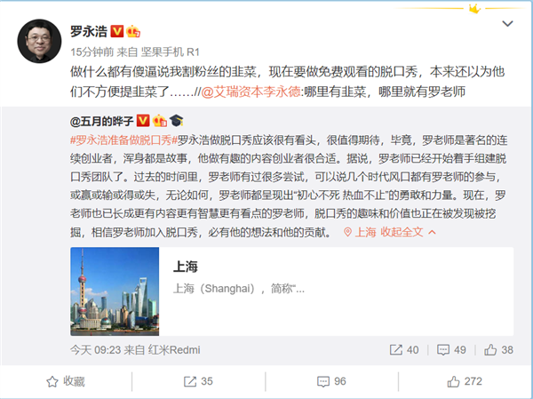 6月22日消息,锤子科技CEO罗永浩在一次访谈中表示要做脱口秀。艾瑞资本李永德称哪里有韭菜,哪里就有罗老师。罗永浩回怼:做什么都有人说我割粉丝的韭菜,现在要做免费观看的脱口秀,本来还以为他们不方便提韭菜了。